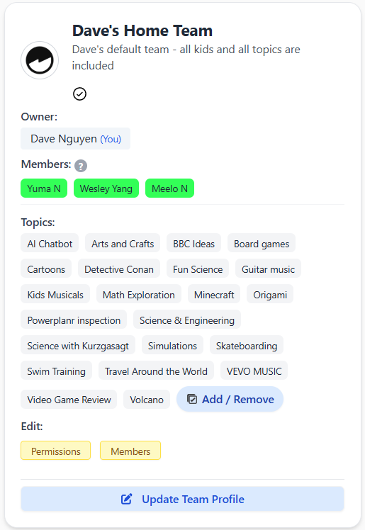 Teams are a way to connect Users to Users, and Users to Topics. If you had a team called "Ben's friends" ... you would add Ben to your team, invite the Parents' of Ben's friends, and those Parents would then add their kids. So, Team Ben's friends would then contain all the parents and kids from that friend circle in one place. Next, that group could share Topics with each other. This helps to ensure that the kids in that group are watching the same content. Users can also message each other from within these teams -- this is a safe environment because all the kids and adults can see the messaging exchange.